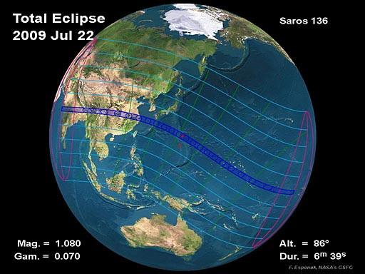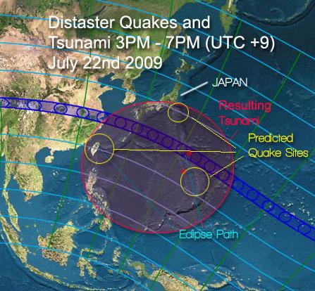 Then you feed in the eclipse data so the moon is orbiting correctly… and let the simulation begin on a certain date. Eclipse and earth quake data below. Quote : On Wednesday, 22 July 2009, a total eclipse of the Sun is visible from within a narrow corridor that traverses half of Earth. The path of the Moon’s umbral shadow begins in India and crosses through Nepal, Bangladesh, Bhutan, Myanmar and China. After leaving mainland Asia, the path crosses Japan’s Ryukyu Islands and curves southeast through the Pacific Ocean where the maximum duration of totality reaches 6 min 39 s. A partial eclipse is seen within the much broader path of the Moon’s penumbral shadow, which includes most of eastern Asia, Indonesia, and the Pacific Ocean.