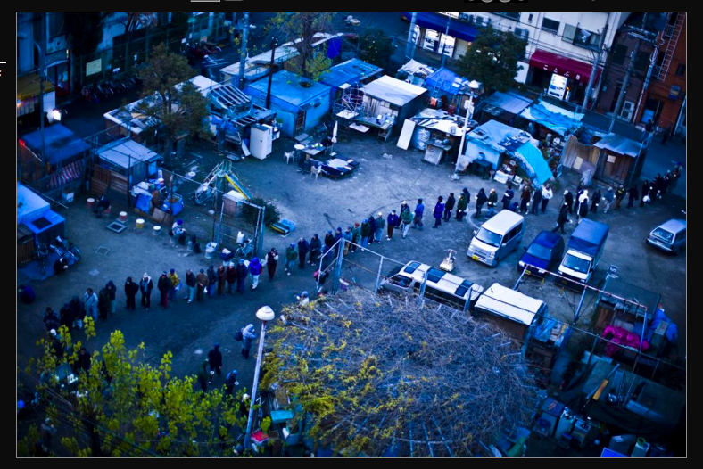 Once a thriving day laborer's town in Osaka, Kamagasaki today is home to about 25,000 mainly elderly day laborers, with an estimated 1,300 who are homeless. It used to be called a "laborer's town" but now it's called a "welfare town," a dumping ground of old men. Alcoholism, poverty, street death, suicide, TB and most of all, loneliness, prevail here. These men don't have family ties and live and die alone as social outcasts from the mainstream "salary man" culture. Labor towns, like Kamagasaki, are on the verge of extinction in Japan. According to the most recent government report, Japan's economy, the world's second largest, is deteriorating at its worst pace since the oil crisis of the 1970s, setting off more unemployment among the young and educated and layoffs among large corporations. It is even more hopeless for graying men of the construction industry here to find work.