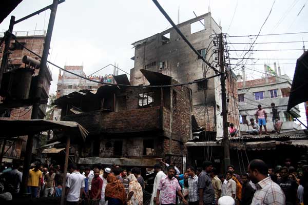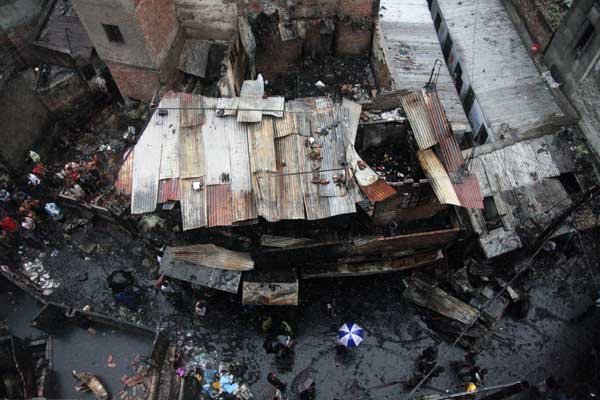 At least 116 people killed in the fire broke out on June 3 at about 9pm at Nawab Katra in Nimtali, Deputy Commissioner of Dhaka district Mohibul Haque confirmed. The fire broke out on Thursday night at about 9pm after the electrical transformer old Dhaka?s Nimtali burst into flames that raced through several apartment complexes, feeding on flammable chemicals and plastic goods in a string of small shops lining the street beneath, media reported. Brig Gen Abu Nayeem Mohammed Shahidullah, the fire service director general, told reporters that most of the victims died due to suffocation and extreme heat as the fire was fuelled by checmicals. This is the second deadly disaster to strike the capital in 72 hours after a five-storey building toppled completely off its base onto several shanties in Tejgaon's Begunbari on Tuesday night, claiming 25 lives. Dhaka, Bangladesh. June 4, 2010. ??Amdadul Huq/DrikNews The surrounding areas of the slum in Nimtali. Dhaka, Bangladesh. June 4, 2010. Amdadul Huq/DrikNews The unusual view of a RAB (Rapid Action Battalion) officer comforting a mourner at Nimtoli. RAB has more notoriously been known for the numerous extra judicial killings (Crossfire).. Dhaka, Bangladesh. June 4, 2010. Coffins laid out in the streets in preparation for burial. Nimtoli fire. Dhaka, Bangladesh. June 4, 2010. Amdadul Huq/DrikNews