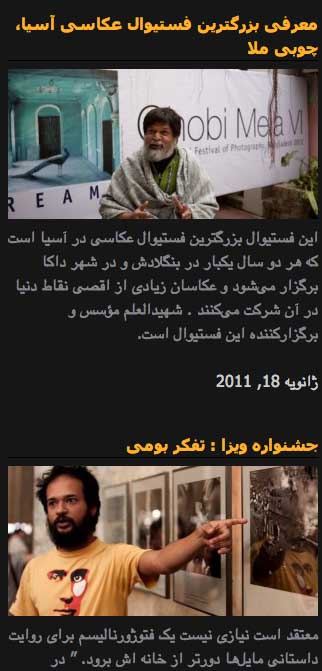 Chobi Mela participant Ali Akbar Shirjian says it is "the first professional website on documentary photography in Persian language. It is the first production of Iran Workshop team to start of own dream through of photography language."