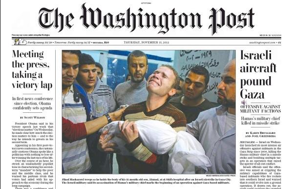 The?front page?photo on?Thursday?s Washington Post?tells, in a single frame, a very personal story from Wednesday?s Israeli airstrikes on the Gaza Strip.?Jihad Misharawi, a BBC Arabic journalist who lives in Gaza, carries the body of his 11-month old son, Omar, through al-Shifa hospital in Gaza City.