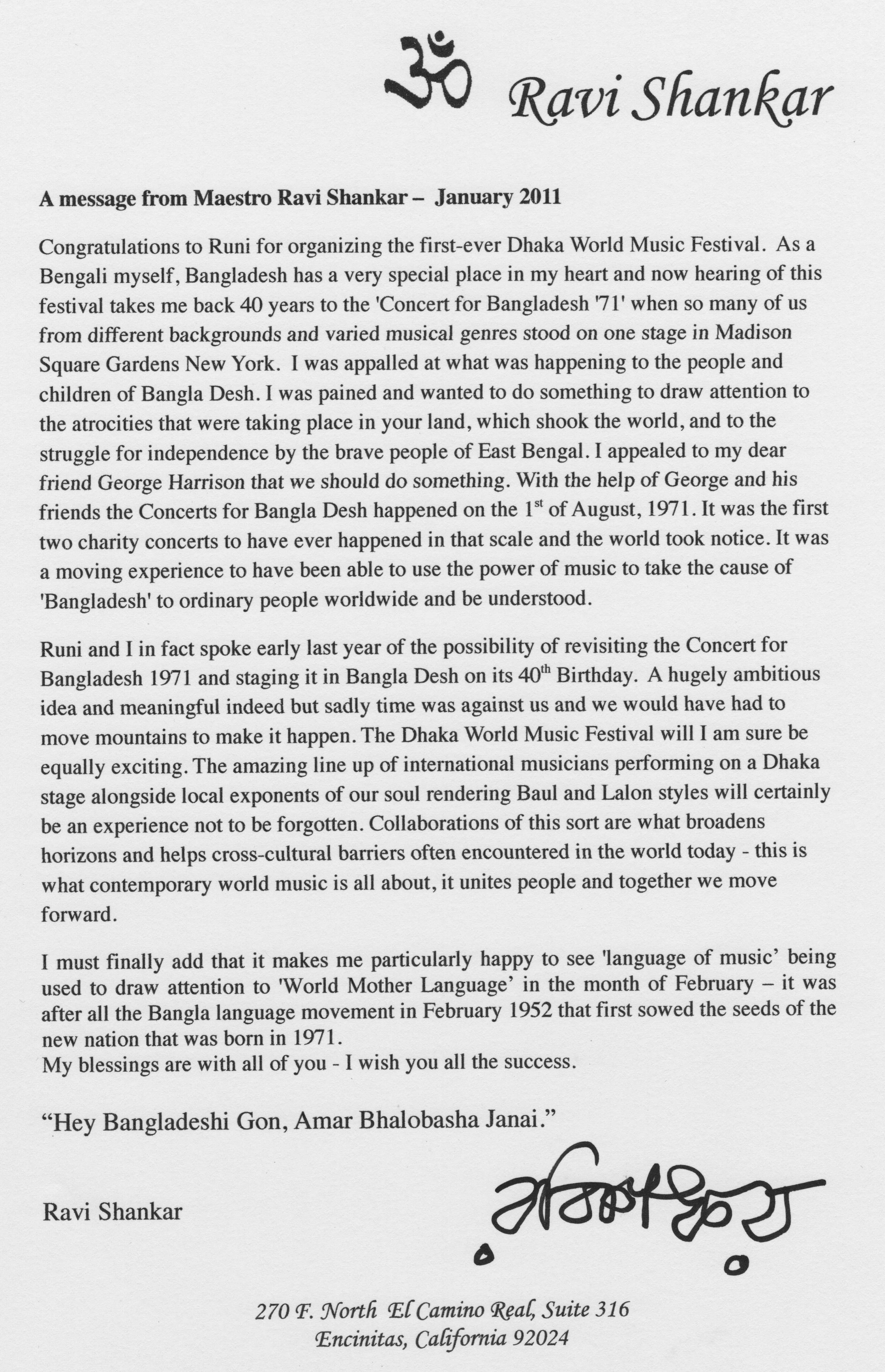 Congratulatory letter from Raviji about the proposed Dhaka World Music Festival by Runi, and the Concert for Bangladesh that we were planning.