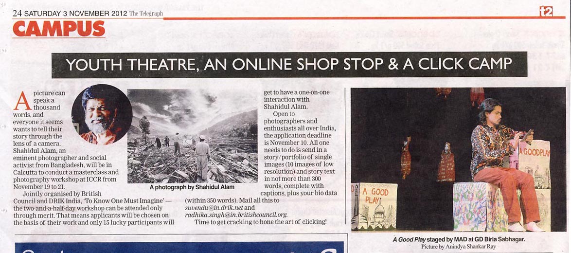 Dr. Shahidul Alam, eminent photographer and social activist from Bangladesh will facilitate a two and half day Master Class and documentary photography workshop titled ?Photography for social impact ? To know, one must imagine? from 19 November ? 21 November 2012 at Indian Council for Cultural Relations ( ICCR) , Kolkata.http://
