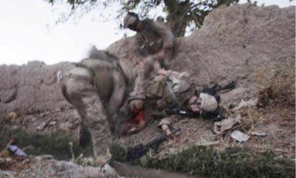 Lance Cpl. Joshua “Bernie” Bernard, 21, lying on the ground with severe leg injuries after being struck by a grenade in an ambush on Aug. 14, his fellow Marines tending to him. Bernard later died of his wounds. Afghanistan. Julie Jacobson/AP