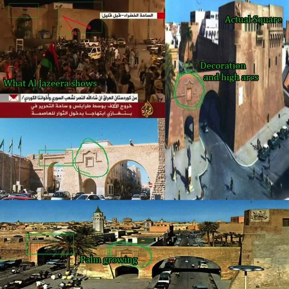 But media critics say, these pictures are an `elaborate and criminal hoax.? That the footage had been prefabricated in a studio in Doha, Qatar. Libya?s Raysse state television warned Libyans about the impending hoax on August 18. Analysts say, the original Bab al-Hurriya (Freedom Gate) has 600 year-old ancient walls around it and motif around the small arch which is absent in al-Jazeera?s live footage, that he street behind the left gate looks unreal (see picture 2). That the hoax was intended to create the impression that Tripoli had fallen. To create panic and chaos. To break the Libyan resistance (Metrogael.blogspot.com). That it also provided cover for the ensuing massacre of civilians. Independent reporter Lizzie Phelan in Tripoli confirmed from what she described as `reliable sources? that the al-Jazeera footage was `false.?