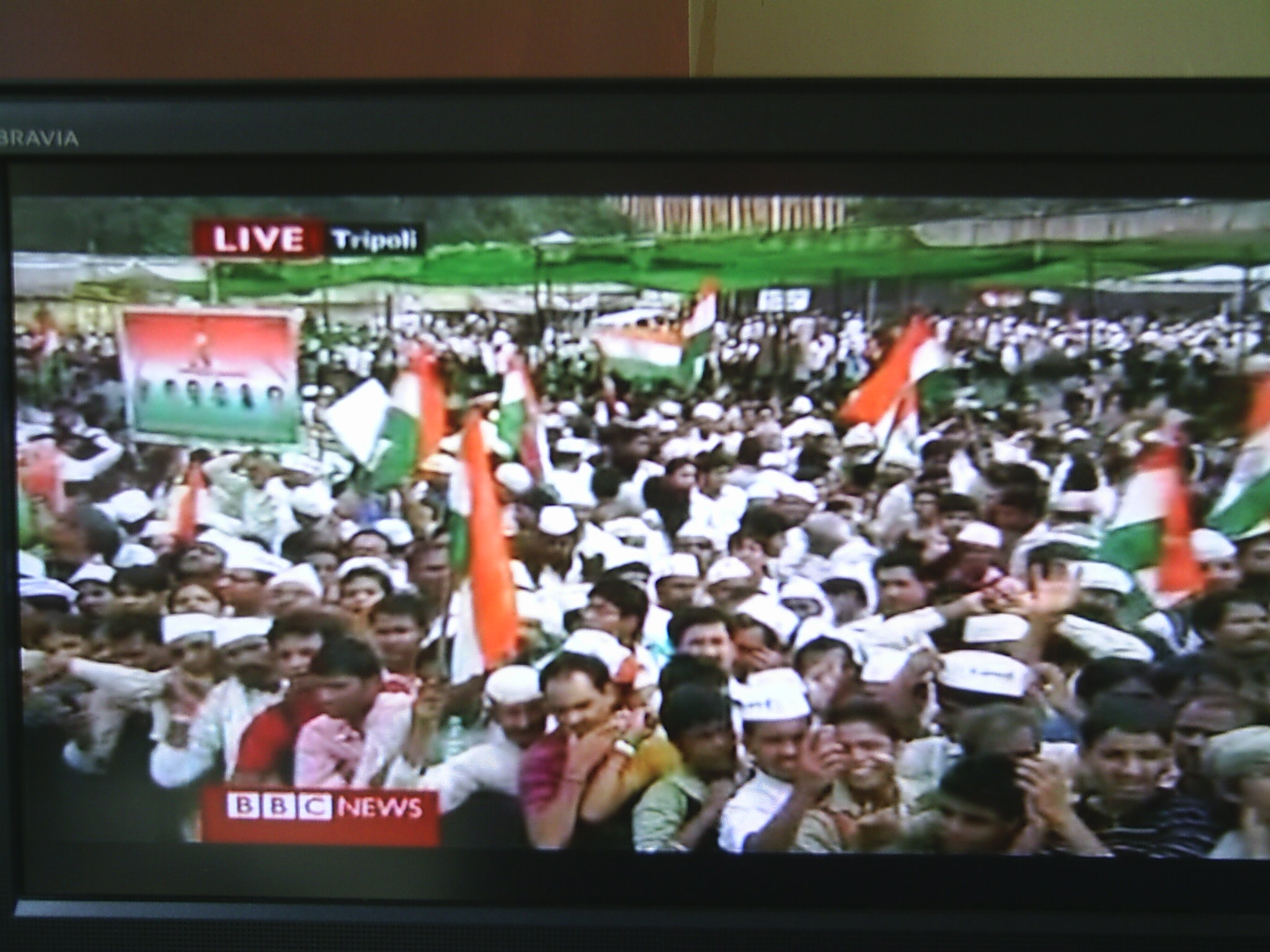 The `fake? Green Square footage was aired on Sky TV too. The BBC, not to be outdone, showed their own live footage from Tripoli, but unfortunately the flag-wavers were not Libyans at all but Indians,?more probably ardent supporters of Anna Hazare (see picture 3). In response to prisonplanet.com?s complaint, the BBC said, the programme?s editors took down the footage on realising their mistake.?But since the BBC no longer enjoys credibility, many are skeptical.